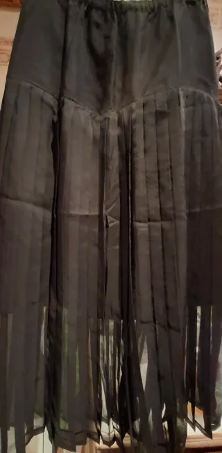 Falda midi negra plisada de terciopelo (100% poliéster). Estilo chic y elegante, ideal para un look de fiesta o casual sofisticado. Cintura elástica y favorecedor corte en A. Talla M. ¡Añade un toque de lujo a tu armario! 📏Medidas Cintura 64 con gomas elastica Largo 83 No te quedes sin ella! Perfecta para tu próxima cena. #FaldaTerciopelo #FaldaMidi #TerciopeloNegro #ModaSostenible #PrendaDeFiesta #EstiloChic #CinturaElastica
