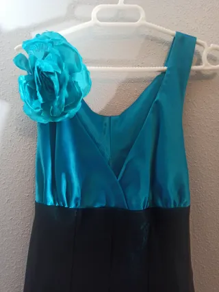 Vestido de fiesta corto con un diseño elegante y moderno. - Cuerpo superior en satén turquesa con detalle floral. - Falda inferior en color negro. - La flor lleva imperdible para colocar la o en un tirante, cinturón o incluso en el pelo ya que lleva goma. La parte de la falda tiene mucho cuerpo, lleva la casa, el raso turquesa, y raso negro con volante La marca etiquetada en Wallapop no corresponde, pero obliga a poner una y no están todas.