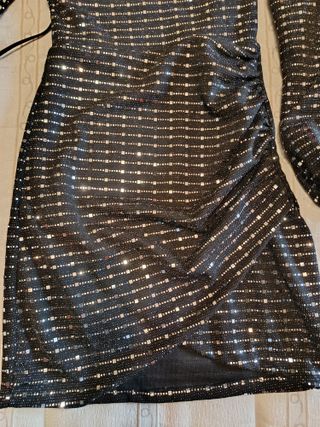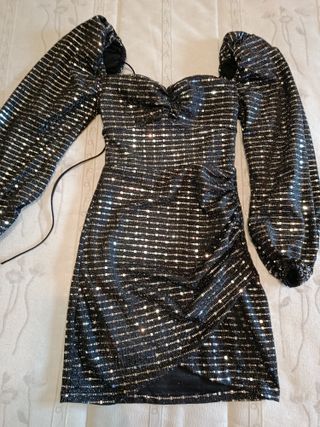 Prenda versátil de Zara con un acabado brillante que combina negro y plateado. Puede usarse como falda larga o como vestido. Talla XS-S (lo que indica la etiqueta) - Diseño con brillos. - Corte ajustado. - Tirantes finos que estilizan la cadera o bien para la parte superior si lo usas como vestido. - Corte midi si es vestido y en el otro caso es falda larga Yo me lo compré pensando que era un vestido y luego vi en la web que era una falda. Es muy útil al poder ser utilizado como ambas prendas. Ideal para una fiesta o un evento de una noche. Solo lo usé 2 veces y está en muy buen estado. Se me quedó pequeño.