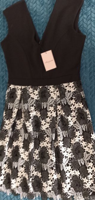 Vestido de fiesta elegante, ideal para ocasiones especiales. Nuevo con etiqueta. De la marca Almatrichi, Talla XL/ Precioso vestido para fiesta, celebración, boda, coctel... En blanco y negro la falda con encaje; cuerpo entallado con cremallera por detrás, queda muy elegante. #vestido#fiesta#boda#coctel#celebración#sin estrenar# Hago envíos Entrega en mano, zonas Cruz del Rayo, Colombia, Pio XII - Diseño de corte en V. - Falda con detalle de encaje floral. - Combinación de colores negro y blanco.