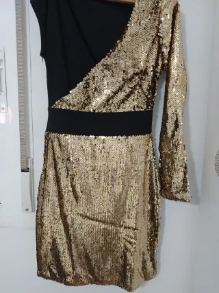 Vestido de fiesta con un diseño llamativo y elegante. - Cuerpo superior negro con detalle asimétrico de lentejuelas doradas. - Manga larga en un lado, cubierta de lentejuelas. - Cintura marcada con banda negra. - Falda con cobertura completa de lentejuelas doradas.