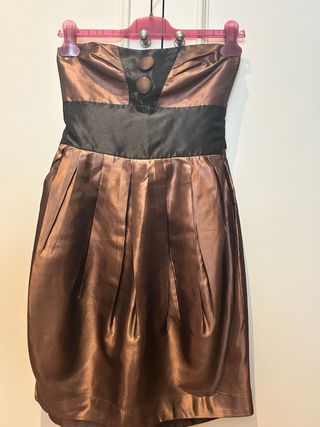 Pecho entallado y con refuerzo para darle mayor firmeza, con tirantes que pueden esconderse para que quede un escote palabra de honor. La falda con vuelo, con realce, porque debajo lleva un tul que hace efecto cancán. Cremallera invisible, cinturón en el pecho de adorno. La tela es brillante gracias a la viscosa. Color marrón y flores negras. Talla S según fabricante, no obstante yo mido toda la ropa que vendo, así es que aconsejo ver fotos con medidas reales. Uso solo una vez, está impecable. 95% algodón 5% viscosa Limpio No lo regalo, si te gusta es tuyo por solo 12 euros. Ver la foto de mi perfil para más información