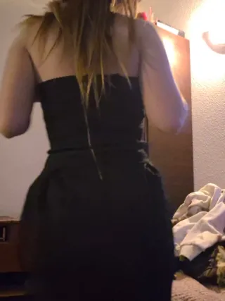 Vestido de fiesta elegante, ideal para cualquier ocasión especial. - Diseño sin tirantes. - Falda con volantes. - Largo hasta la rodilla. Elegante vestido negro, ideal para ocasiones especiales. Su diseño sin tirantes y falda con vuelo lo hacen muy favorecedor. - Tejido ligero y vaporoso. - Detalle de volantes en la falda. - Largo hasta la rodilla. Talla S. Lo compré pero me equivoqué con la talla y por eso lo vendo (no lo he usado nunca). Lleva argollas para complementarlo con un cinturón si se desea. fiesta, boda, invitada, cocktail, nochevieja
