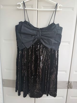 Vestido de fiesta con lentejuelas negras y un gran lazo frontal. - Diseño con tirantes finos. - Cuerpo superior con detalle de lazo. - Falda cubierta de lentejuelas brillantes.