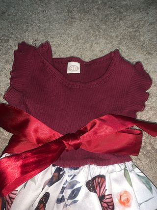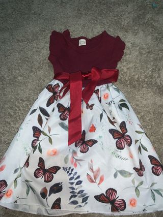 Vestido de fiesta para niña con un bonito estampado. - Cuerpo de punto en color burdeos. - Falda con estampado de mariposas y flores. - Lazada de satén en la cintura.