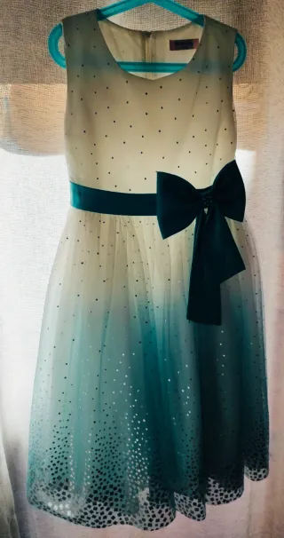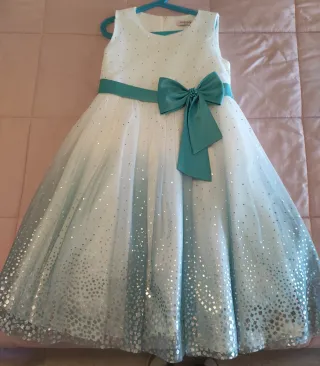 Vestido de fiesta para niña con un diseño elegante y festivo. Talla 14/ 156-160 cm - Cuerpo blanco con detalles brillantes. - Falda de tul con degradado de color turquesa y plateado. - Cinturón ancho de satén turquesa con lazo. - Adorno de perlas en el centro del lazo.