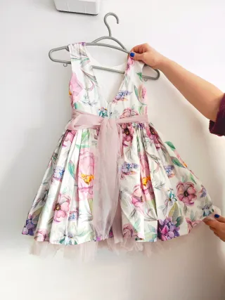 Vestido de fiesta para niña de C&A con un bonito estampado floral y detalles de tul. Usado una vez. - Diseño sin mangas. - Estampado floral en tonos pastel. - Capa exterior de tul con topos. - Cintura marcada y falda con vuelo.