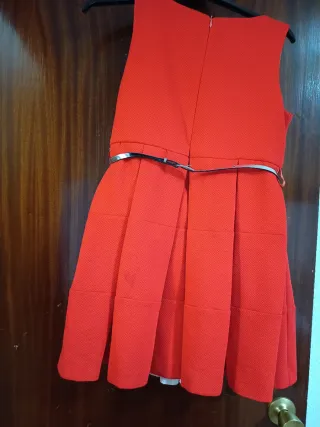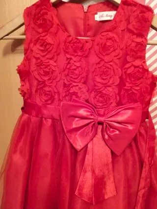 Vestido de niña ideal para ceremonias o fiestas. Presenta un diseño alegre y festivo. - Talla 12, pero mi hija lo usó con 10 porque ella es bastante alta. - Diseño con estampado de pétalos. - Corte halter. - Falda con vuelo. -Incluye rebeca roja, corta, de sfera. Lo utilizó mi hija como segundo vestido de comunión y estaba espectacular.