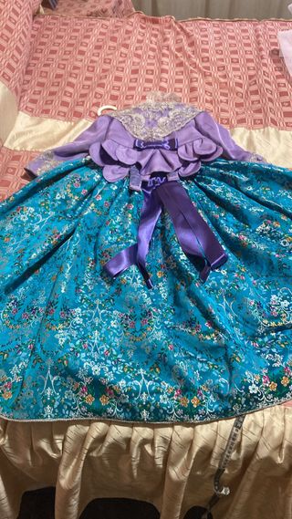 Precioso traje de fallera para niña, ideal para fiestas y celebraciones. - Conjunto de dos piezas: corpiño y falda. - Corpiño de manga larga en tono lila con detalles bordados. - Falda larga con estampado floral en tonos turquesa y detalles dorados. - Delicado encaje sobrepuesto en la falda. - Incluye zapatos a juego. Falda Largo 70cm Cintura 29cm Corpiño 37cm espalda 27 cm pecho Hombro 28cm  Manga 39 cm Zapatos 20cm