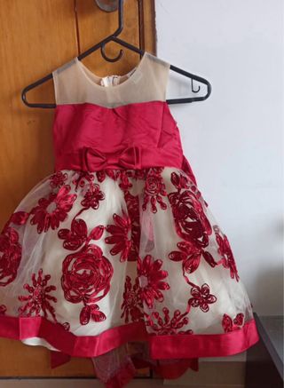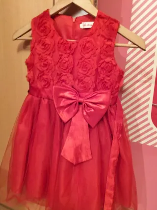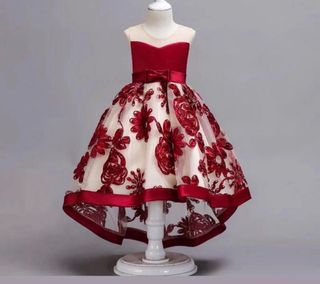 Vestido de fiesta para niña con un diseño elegante y festivo. Talla de 5 a 6 años - Cuerpo superior en satén rojo. - Falda de tul con bordados florales en rojo. - Cinturón con lazo. - Corte asimétrico en la falda.