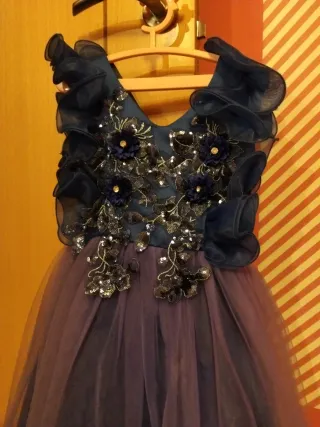 Vestido de gala para niña con un diseño elegante y detalles encantadores. - Cuerpo del vestido en azul marino con aplicaciones florales y pedrería. - Mangas abullonadas y volantes en los hombros. - Falda de tul en tono morado. - Cierre de cremallera en la espalda.