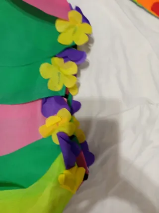Falda hawaiana de colores vibrantes, ideal para fiestas o disfraces. - Diseño con hojas superpuestas. - Adornada con pequeñas flores. - Talla única adaptable.