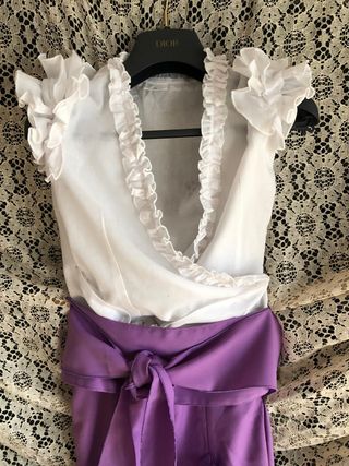 Conjunto de blusa y falda de flamenca para niña, con fajín a juego. Ideal para fiestas o actuaciones. Muy poco usado, casi NUEVO. - Falda morada con múltiples volantes. Fajín a juego. BLUSA de algodón pone en la etiqueta talla 8, la sisa mide 39 cm. FALDA de poliéster pone talla 10 pero creo que la medida de la cintura y las caderas son de talla menor, de todas formas tiene muchísimo para ampliar en las costuras de ancho, como se ve en la foto, de largo no tiene nada para ampliar, de ancho si tiene bastante. Medidas FALDA de cintura 26,5 cm , caderas 36 cm y largo 90 cm. POR FAVOR ANTES DE COMPRAR COMPROBAR CON LAS MEDIDAS.