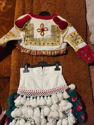 Traje de cigarron para niños de 2 a 5 años. Ideal para fiestas y eventos. - Chaquetilla con adornos dorados y rojos. - Falda con flecos y pompones de colores.