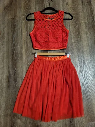 Conjunto de dos piezas en color rojo, ideal para eventos o fiestas. - Crop top con detalles de encaje. - Falda de tul con cinturilla satinada. - Nuevo sin etiqueta - Talla 36.
