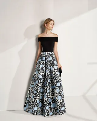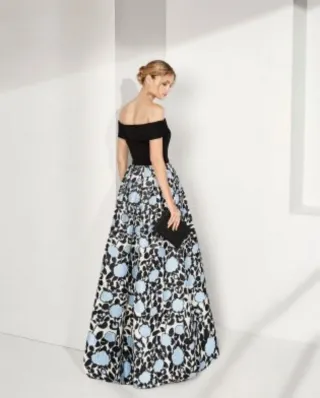 Elegante vestido de fiesta de Rosa Clara, perfecto para eventos especiales. Hecho a medida. Talla 40 (Vale para 38 y 42) altura 153 + 12 tacón - Cuerpo negro de escote Bardot. Ajustado con ballenas que realza la silueta - Falda larga drapeada, con estampado floral en tonos azules y negros - Tejido con textura. Costó 800€ en 2019. Solo se uso una vez de madrina