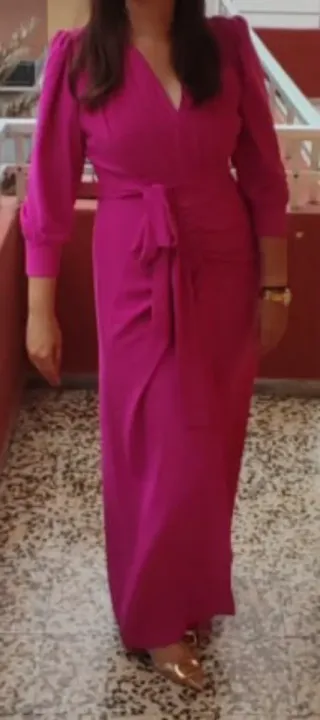 Vestido largo de fiesta en color buganvilla, talla 42. - Diseño con escote en V. - Mangas largas abullonadas. - Detalle drapeado en la falda. - Abertura delantera
