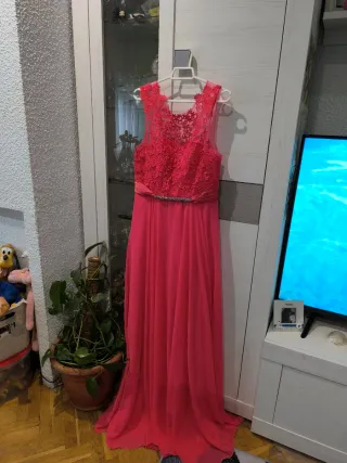 Elegante vestido de fiesta en color rosa, ideal para eventos especiales. Su diseño favorecedor lo hace perfecto para cualquier celebración. - Corte imperio. - Tirantes finos adornados. - Falda larga y fluida. - Usado en 1 ocasión. - Mi altura 1'72.