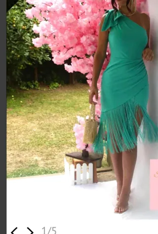 Elegante vestido de fiesta en color verde. - Diseño asimétrico de un solo hombro. - Detalle de fruncido en la cintura. - Falda con flecos decorativos. Lo compre para la comunion de mi hija y he encontrado otro que me gusta mas y no puedo descambiarlo. Esta sin usar