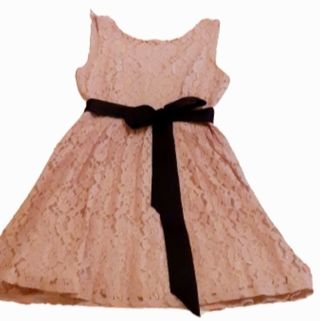 Vestido corto de vestir de color rosa palo. Es corto, por encima de la rodilla. Está hecho con un bonito encaje rosa y va forrado por todo el cuerpo del vestido. El bajo de la falda lleva un doble forro de tul, lo que le da más vuelo y hace que siente mejor. Incluye un lazo negro que puede usarse a modo de cinturón. Se ha usado sólo una vez. Está en perfecto estado, salvo por un pequeño enganchón en el lazo (puesto no se aprecia).