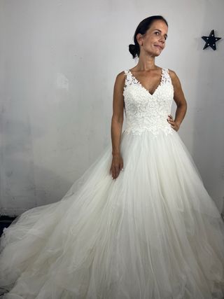 Pregunta sin compromiso y precio negociable.☺️ Vestido estilo princesa con falda de tul y precioso cuerpo de encaje con pedrería. Escote en V muy favorecedor y diseño romántico y elegante.Talla aproximada 40-42. Se realizaron pequeños arreglos en la parte superior para ajustarlo mejor, pero se puede volver a adaptar fácilmente. La espalda también permite ajustes. Altura de la novia: 1,60 m + tacones de aproximadamente 10 cm. El vestido está en muy buen estado. No incluye velo ni cancán. Precio en tienda alrededor de 1.400-1.600 €. Perfecto para una novia que busque un vestido precioso de una marca reconocida a un precio accesible.