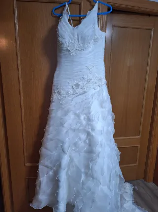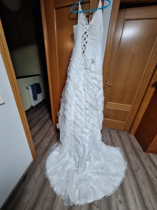 Elegante vestido de novia con un diseño de volantes espectacular. - Diseño strapless. - Cierre de botones en la parte frontal. - Falda con múltiples capas de volantes. - Tejido vaporoso y con textura. Es una talla 40 porque me lo arreglaron. Me costo 2000€