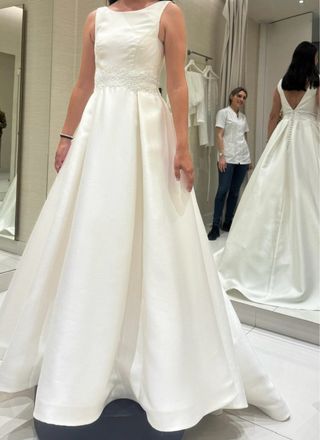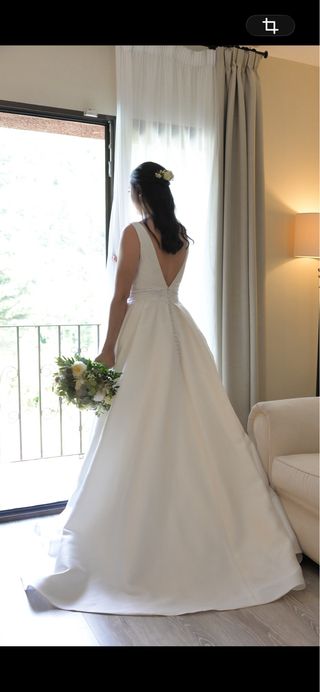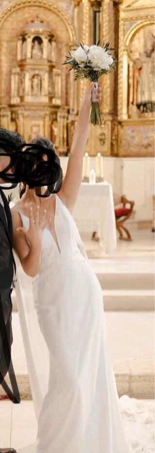 Vestido de novia de la colección 2025. Falda larga con cola. La parte de arriba es con pedrería muy sutil que aporta luminosidad y con escote en V. La espalda es de escote cuadrado. El vestido está nuevo, se usó para la ceremonia. Mis medidas son 85-66-96. Se vende opcionalmente con velo elegante muy sencillo sin puntilla ni detalles (es el tul con la peineta de plástico) por 50€ más. El vestido me costó 2.520€ en tienda (conservo la factura y todas las etiquetas)