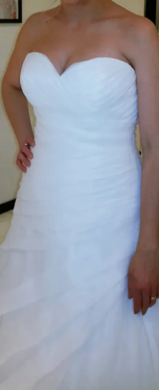 Elegante vestido de novia de Rosa Clará, en perfecto estado. El vestido se ha usado una única vez, está nuevo prácticamente. No tiene manchas ni rasgaduras, tallas: pecho 90 cm, cintura 70 cm y cadera 97cm. Estilo del vestido: princesa, escote en V, espalda descubierta, con lentejuelas, capas en la falda, color blanco puro, es ligero, tiene copas integradas. Complemento: cola y cancan de sirena si se quiere, dado que esta última está algo raído. Motivo de la venta: soy el marido y no tenemos pensado casarnos otra vez.