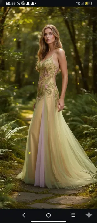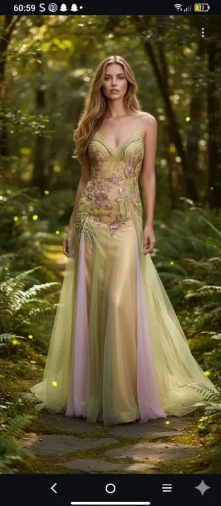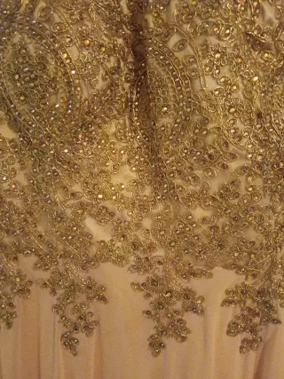 Vestido elegante de fantasía para bodas o comuniones. Su diseño combina tonos dorados y pastel con detalles de pedrería y aplicaciones florales. - Diseño con tirantes finos. - Falda larga de 3 capas. - Tejido principal con brillo sutil. - Superposición de tul en tonos pastel. INCLUYE EL FULAR ROSA A JUEGO Usado en una ocasión. Se compró en la tienda de novias Carbonell y su precio fue de 300€