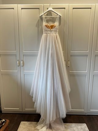 Elegante vestido de novia de Rosa Clara, con un diseño delicado y romántico. - Cuerpo con detalles de pedrería y encaje. - Falda vaporosa de tul. - Espalda en V con tirantes finos. -Limpieza realizada en tintorería (200€) -Precio algo negociable