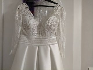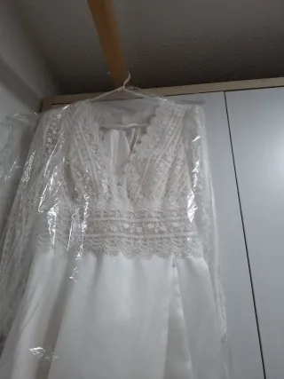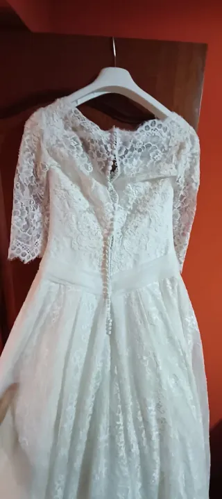 Vestido de novia elegante, usado una sola vez. - Diseño con encaje. - Mangas largas de encaje. - Cinturón fino en la cintura. - Falda amplia con poca cola. Talla M 38. Muy cómodo. Preguntar precio por privado.