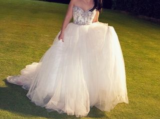 Vestido de novia de la marca Rosa Clará, con detalles de pedrería y tul. - Cuerpo con pedrería y escote ilusión. - Falda de tul vaporosa. - Diseño elegante y romántico. Cierre con cremallera lateral invisible. Tiene un lacito azul por la tradición de llevar la novia algo azul Se recomienda lavar en sitio especializado por almacén y probador. Se recomienda comprobar medidas por qué talla más pequeño. Medidas (tomadas a mano por lo que puede variar en 1-2cm): Pecho : 50 cm ( de axila a axila) Cintura: 40cm Largo delantero:120cm Largo cola: 180 cm