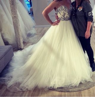 La talla del traje es 44, pero está adaptado a una 40, si necesitas medidas te las proporciono. Se le puede sacar. Elegante vestido de novia de Rosa Clara. Es un dos piezas - Diseño strapless con cuerpo de encaje. - Cinturón de satén con lazo. - Falda de satén con volantes de tul y encaje en el bajo.