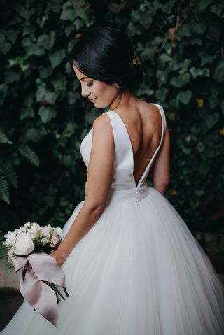 Elegante vestido de novia de Rosa Clará, modelo Aida. Un diseño que combina sofisticación y un toque moderno. - Escote en V pronunciado en la espalda. - Falda voluminosa de tul. - Detalle de botones en la espalda. - Incluye cancán y velo