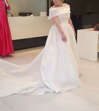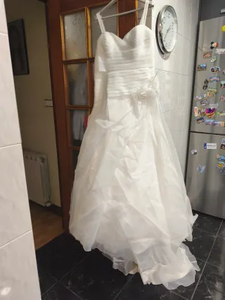 Vestido de novia de la marca Rosa Clara, con un diseño palabra de honor. - Cuerpo ajustado. - Falda voluminosa de seda con cola. - Color blanco. - Es talla 38, pero indica 40, está arreglada para altura 1,60.