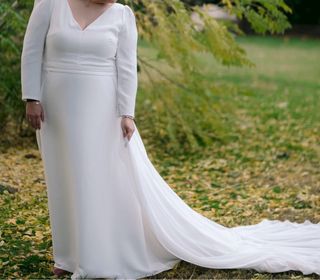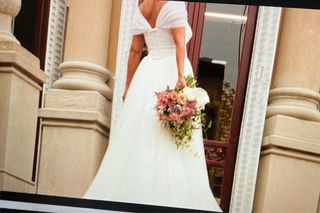 Elegante vestido de novia de m Rosa Clará, lo compré en la temporada 2024/25. Es un set de dos piezas, vestido y capa. El vestido no lo venden como tal, lo confeccioné escogiendo el cuerpo de su vestido “ADONIS” y poniéndole una falda de Crepe de seda que fue confeccionada a medida. Se completa con un escote cuadrado, una espalda descubierta, tirantes y una capa de georgette. Soy una chica de 1,77 m y llevé un tacón de 5 cm. Soy una talla 38 de pantalón y M de parte de arriba. El vestido esta perfecto. Lo vendo en Oviedo/Pamplona Tengo las facturas pagadas en 2025 de todo lo que me costó el vestido, para mostrar en la prueba.