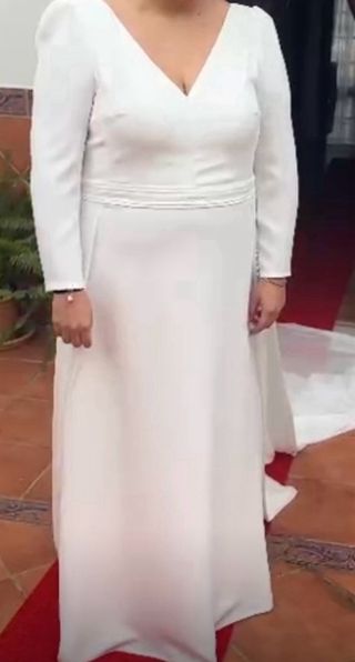 Elegante vestido de novia de corte clásico. - Diseño con escote pronunciado. - Mangas largas con detalles. - Falda fluida. Es de la marca Alma (submarca de Rosa Clará) blanco. Tiene una pequeña cola que desde el adorno de la cintura al suelo mide 1'85. La misma medida por la parte delantera es 1'16. Tiene una sobrecola que mide 2 metros y su velo de Martha Blanc (enganchado en los hombros con dos botones perlados) de 3 metros. Está todo muy bien conservado y no hay nada roto (los bajos incluso están perfectos)
