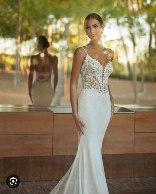 Elegante vestido de novia Rosa Clará, color blanco, cuerpo sirena ,talla 38. Incluye velo y cancán - Escote en pico en la espalda. - Espalda descubierta - Falda de cola larga y fluida. - Tejido crepé de alta calidad - Abotonado con cremallera - Tirantes de pedrería Medidas: Pecho: 85cm Cintura: 70cm Cadera: 98cm Largo: 156cm Cola: 60cm aprox