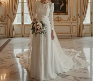 Elegante vestido de novia de Rosa Clara. Diseño clásico y sofisticado. - Manga larga. - Escote redondo con detalles de encaje. - Falda larga con cola. -No se vende velo - Año 2022-2023 - Hecho a medida por la modista (S-M)