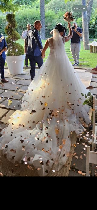 Vestido de novia estilo princesa con corte A y cola larga. Talla S. Precioso vestido valorado en 2500€, de la gama Alma Novias de Rosa Clará. Diseño moderno y actualizado. Comprado en noviembre de 2025. Se utilizó una vez y se encuentra en perfecto estado, y además de bien cuidado ha sido lavado cuidadosamente en lavandería (apenas tenía suciedad), por lo que está igual que a estrenar. Siéntete como una princesa, con un vestido muy moderno, favorecedor y a un precio muy competitivo. - Diseño de tirantes con hombros descubiertos. - Cuerpo con escote en V y detalles de pedrería. - Falda voluminosa con aplicaciones de encaje.