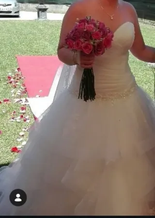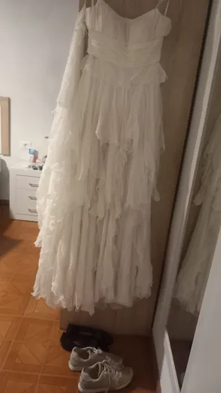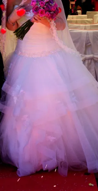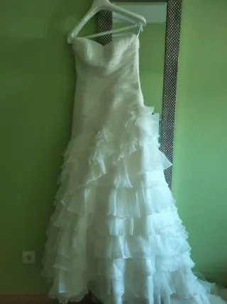 Elegante vestido de novia con un delicado tono blanco. Diseñado para un día especial. - Diseño strapless. - Falda con volantes y cola larga. - Detalle de encaje en el velo. Lo vendo por falta d espacio en su día costo 2000 euros,verlo sin compromiso alguno x q es precioso y en foto n se aprecia bien lo bonito q es tiene un toque de pedreria.