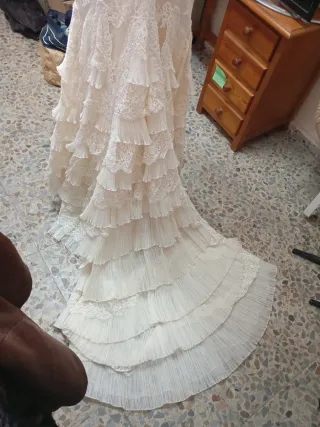 Vendo precioso vestido de novia original de Rosa Clará, estilo princesa, muy elegante y atemporal. Tiene una falda amplia de tul con muchas capas, que le da un movimiento espectacular y un aire romántico sin ser recargado. El cuerpo es de encaje delicado, con un estilo bohemio/indie pero con mucha clase, favorecedor y muy femenino. Es un vestido que queda increíble en persona y en fotos, cómodo para llevar todo el día y perfecto para una boda especial. 💍 Incluye tocado a juego, ideal para completar el look de novia de forma armoniosa y elegante. 📏 Talla aproximada: 36 🧵 Estado: en perfecto estado. Llevado a tintorería.