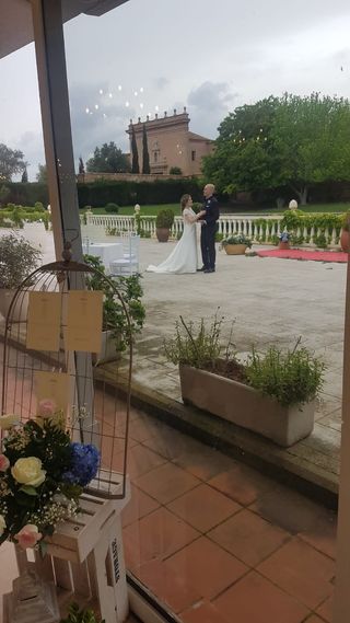 Vestido de novia de Rosa Clara. Talla 40 (aunque de normal yo suelo usar una talla 38). No tiene mucha cola, es un vestido súper cómodo, fácil de poner y muy bonito, que sienta bien a diferentes tipos de cuerpos (puede apreciarse en la foto tres chicas diferentes que lo llevan y les sienta bien a cada una de ellas). Son dos piezas diferentes, por un lado la parte de arriba (no necesta llevar bajo nada porque no transparenta) y la falda (con tres capas de tela que ayuda a que no se marque nada y siente perfecto) Medidas importantes: máximo de cintura unos 70cm, estatura aproximada 1.60m. Usado solo para la ceremonia.