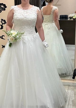 Elegante vestido de novia de corte princesa. Presenta un escote Bardot con detalles de pedrería y una falda voluminosa con varias capas de tul. -Da hasta una talla 46 -Zapatos talla39 y diadema por 20€ mas.