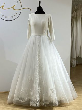Elegante vestido de novia con detalles de encaje y mangas 3/4. Usado una vez y pasado por tintorería. La talla corresponde a la talla real de ropa normal, en el tallaje de novias supongo que sería XL. Medidas: hombros: 44 cm contorno total pecho: 100 cm cintura: 42 cm largo de falda desde la cintura por delante: 119 Largo de falda (tipo cola) desde la cintura por detrás: 174 cm Yo mido 1,71 cm. - Cuerpo con escote ilusión y detalles de encaje. - Mangas de tul con aplicaciones de encaje. - Falda voluminosa con 3 capas de tul y una de algodón tacto raso, con cola. - Cierre de cremallera en en la espalda, y botones de adorno.