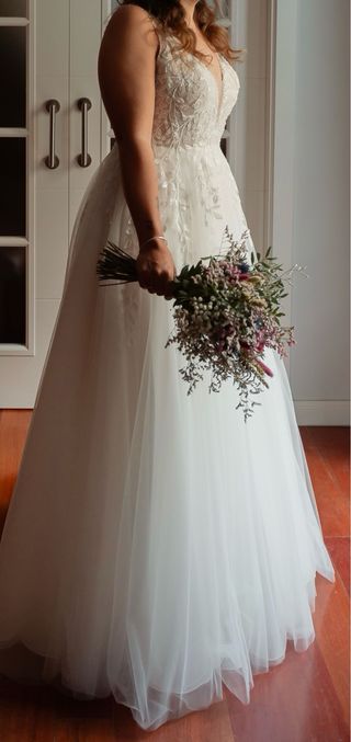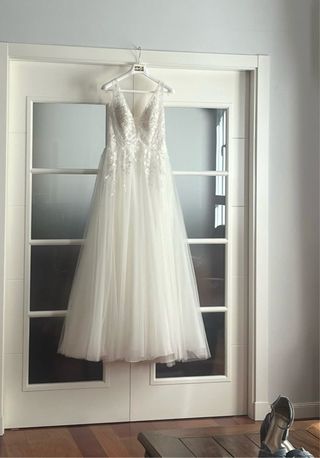 Vestido de novia de corte princesa, con bordados y aplicaciones. La falda cuenta con varias capas de tul. Lleva cazuelas internas que sujetan muy bien el pecho y lo realzan. No es necesario llevar sujetador. La espalda es abierta, abotonada y queda preciosa. Nunca lo he alquilado ni prestado, solo me lo he puesto yo. Costó 1800€ a finales de 2023.