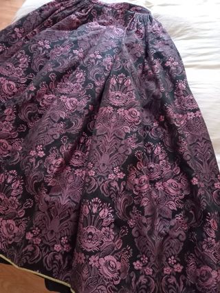 Falda tradicional de novia alicantina con un diseño vibrante y detallado. Tiene para sacar de cintura y de largo largo tiene 1m Confeccionada por Ramos indumentaria - Estampado floral multicolor sobre fondo rosa. - Diseño con pliegues en la parte superior. - Tejido con detalles plateados y dorados. muy bien cuidada