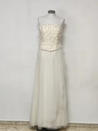 Elegante vestido de novia con un cuerpo adornado con flores. - Cuerpo con detalle de flores. - Falda larga y vaporosa. - Escote palabra de honor. - Cierre trasero con cremallera invisible. Le falta algunas flores. Tiene el bajo del vestido sucio. Se recomienda lavar en sitio especializado por almacén y probador. Se recomienda comprobar las medidas porque talla pequeño. Medidas ( tomadas a mano por lo que puede variar en 1-2cm): Pecho: 44 cm Talle: 25 cm Cintura: 42 cm Largo: 105 cm Largo trasero: 135 cm