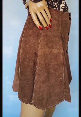 Hoy a las 12 se acaba la oferta del codigo descuento. DESCUENTO YA APLICADO 🔒PRECIO 🔒 Obtén un 10% dto. SI COMPRAS UN LOTE DE 2 ARTÍCULOS Y 1 solo Gasto de Envío. Codigo descuento para compras realizadas en Enero de mas de 20€ CUESTAENERO Minifalda de los años 70, realizada en ante marrón, con forma de A. Realizada mediante piezas en forma de pétalo, cosidas entre si, a una cinturilla del mismo material y doble tapeta con corchetes como sistema de cierre. Es un clásico, que nunca pasa de moda y queda muy bien con un montón de combinaciones. Doy medidas para que comprobéis la talla. Contorno de cintura: 73cm y Largura total: 37cm.