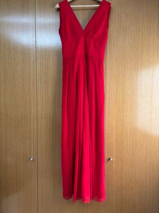 Elegante vestido largo de color rojo, ideal para eventos especiales como bodas. - Diseño con escote en V cruzado. - Tirantes finos. - Cintura elástica. - Falda larga y fluida.